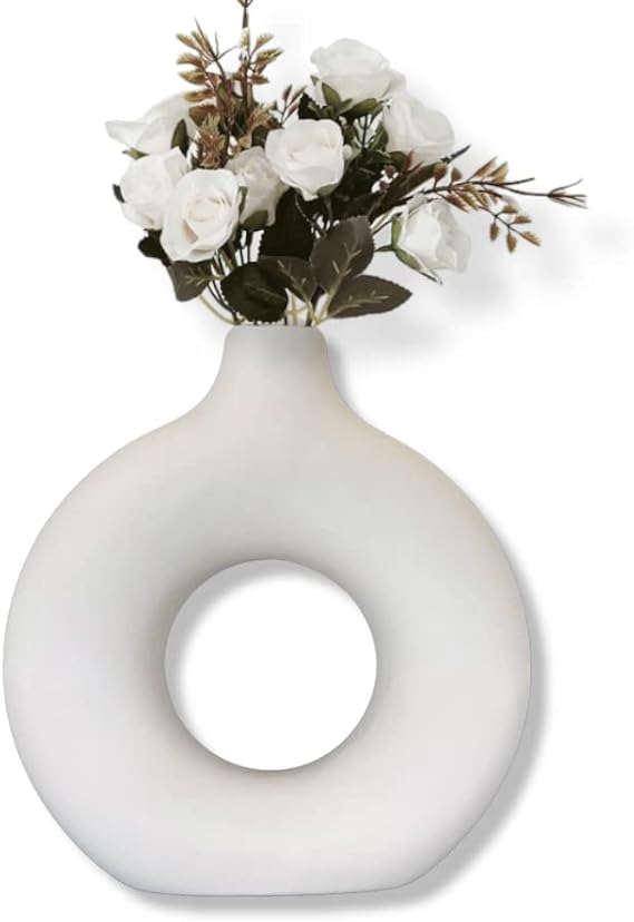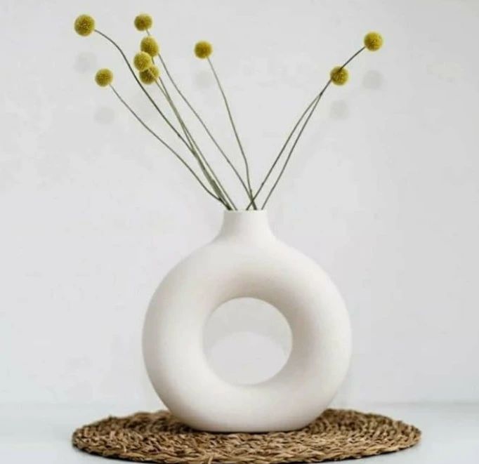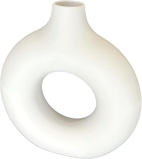 مزهرية مصنوعة من الخزف الأبيض بتصميم دائري مميز. تتميز بفتحة في المنتصف، ما يجعلها قطعة فنية جذابة تناسب أي ديكور داخلي. مثالية لعرض الزهور أو كقطعة زخرفية بمفردها.