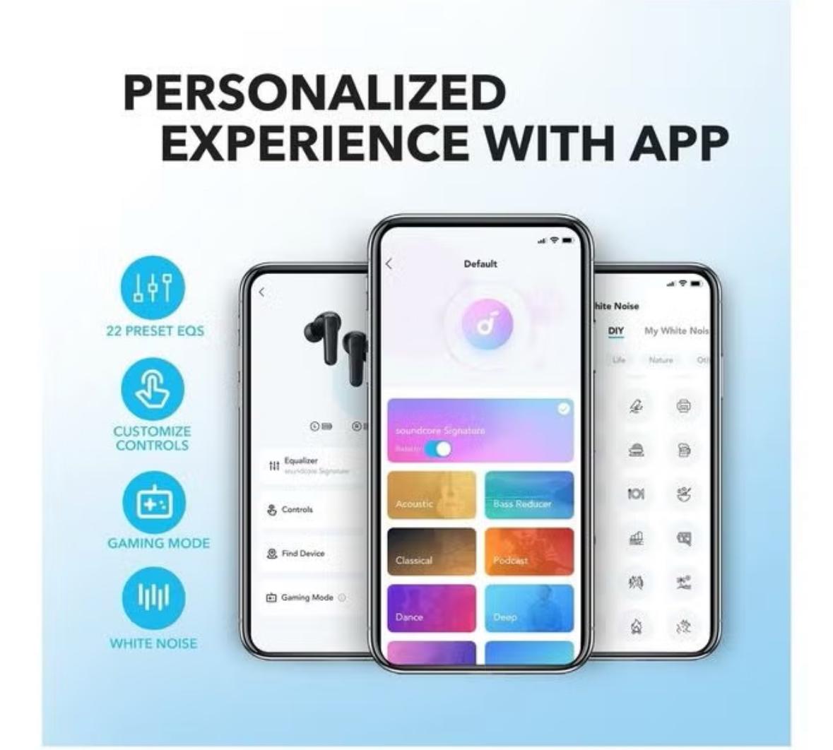 تجربة استماع مخصصة: استخدم تطبيق soundcore لتخصيص عناصر التحكم والاختيار من بين 22 إعدادًا مسبقًا لمعادل الصوت. باستخدام ميزة "Find My Earbuds"، يمكن أن تصدر سماعة الأذن المفقودة ضوضاء لمساعدتك في تحديد موقعها